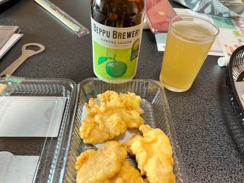 温泉上がりにビールととり天をいただきました笑